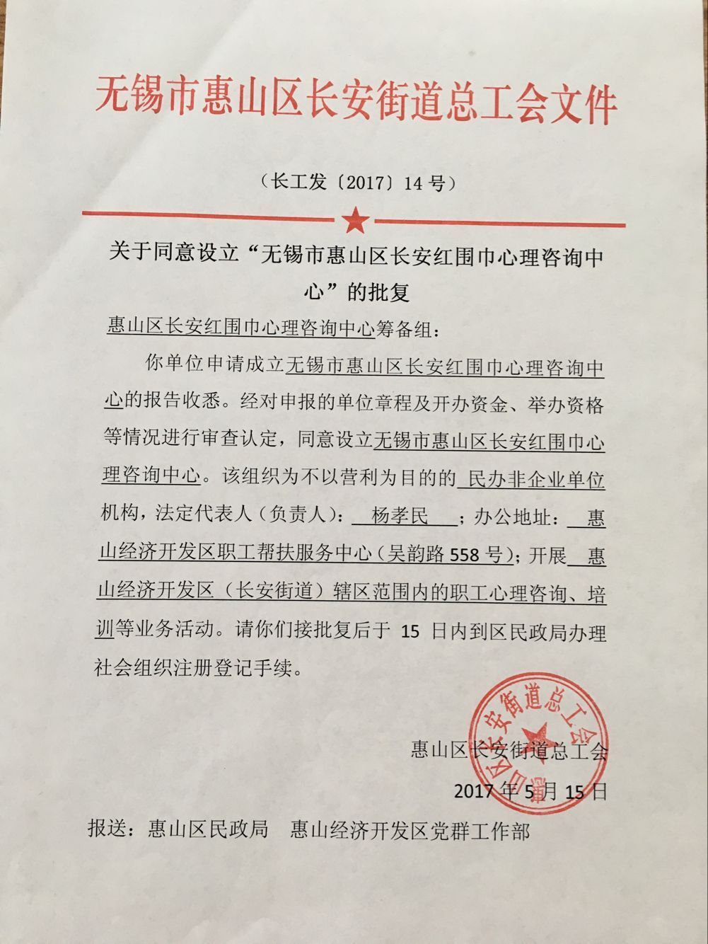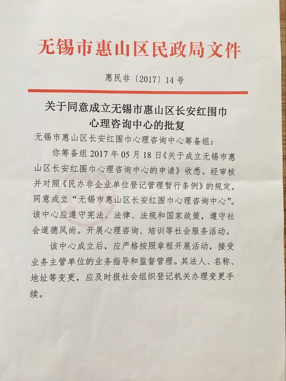 為了更好為園區乃至開發區創業企業服務,園區精心打造了企業EAP服務平臺,經惠山經濟開發區(長安街道)總工會(長工發【2014】14號)批準,惠山區民政局(惠民非【2014】14號)注冊登記設立“無錫市惠山區長安紅圍巾心理咨詢中心”。