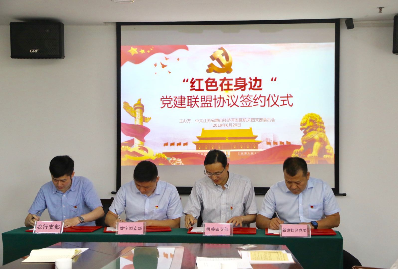 為深入貫徹黨的十九大精神,提高基層黨支部黨建工作質量,提升基層黨支部組織力、戰斗力,6月20日下午,數字園管理支部與開發區機關四支部、新惠社區委員會、農行惠山支行業務部支部召開黨建工作聯席會議,共同簽署“‘紅色在身邊’黨建聯盟協議”,正式開啟了“資源共享、優勢互補、注重實效”的支部共建工作。惠山經濟開發區黨工委副書記楊丹、數字園黨支部郭富彬、開發區機關四支部陳文虎、新惠社區黨委吳建勛和農行惠山支行業務部支部任震飛等相關負責人出席了簽約儀式。