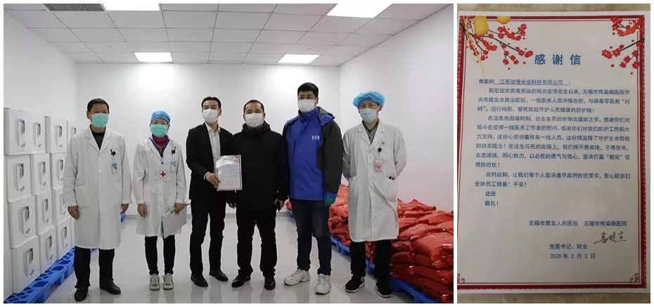 2020年2月2日,入園企業(yè)-江蘇潔澄水業(yè)科技有限公司,由企業(yè)董事長(zhǎng)親自帶隊(duì)親臨無(wú)錫醫(yī)護(hù)一線,給抗擊疫情的醫(yī)護(hù)工作人員送上健康飲用水,合計(jì)向無(wú)錫市人民醫(yī)院和無(wú)錫市第五人民醫(yī)院捐贈(zèng)400袋純凈袋裝水和200臺(tái)即熱式飲水機(jī)。除此以外,企業(yè)負(fù)責(zé)人表態(tài)將根據(jù)各醫(yī)院的用水情況,持續(xù)捐贈(zèng)至疫情結(jié)束。