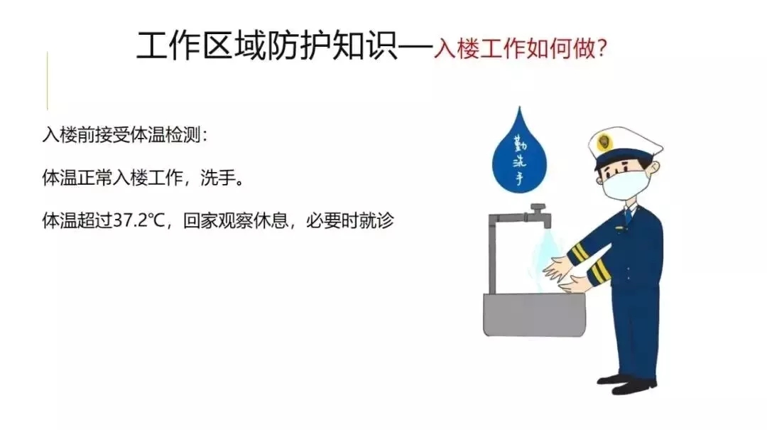 進入辦公樓前自覺接受體溫檢測,體溫正常方可入樓工作,并至衛(wèi)生間洗手。若體溫超過37.2℃,請勿入樓工作,并回家觀察休息,必要時到醫(yī)院就診。