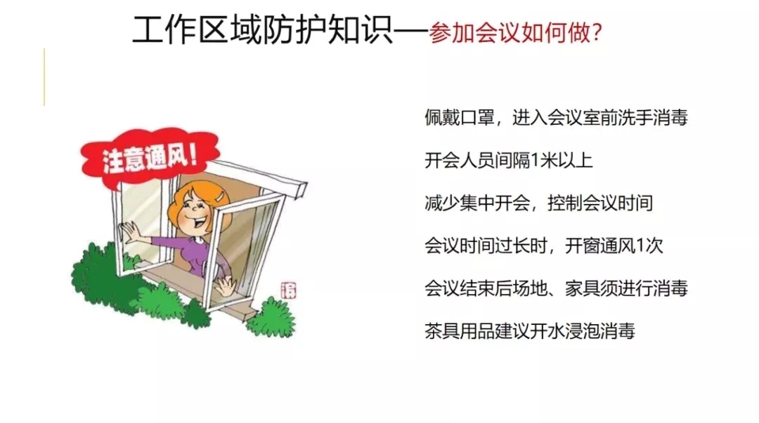 建議佩戴好口罩,進入會議室前洗手消毒。開會人員間隔1米以上。減少集中開會,控制開會時間、會議時間過長時,至少開窗通風1次。會議結束后,場地、家具須進行消毒。茶具用品建議開水浸泡消毒。