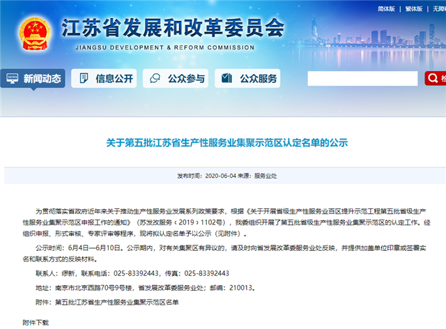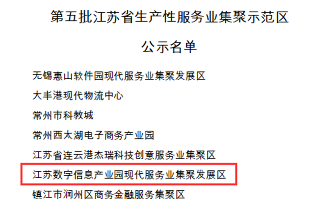 2020年6月4日,江蘇省發改委公示了第五批省級生產性服務業集聚示范區的認定名單,江蘇數字信息產業園榜上有名。