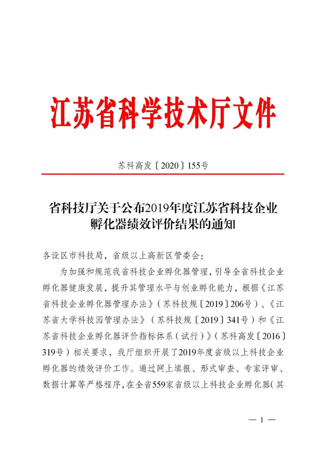 近日,江蘇省科學技術廳公布了關于2019年度江蘇省科技企業孵化器績效評價結果的通知,無錫力合科技孵化器有限公司獲評2019年度江蘇省優秀(A類)科技企業孵化器。