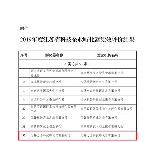 喜報頻傳 | 無錫力合科技孵化器獲評2019年度江蘇省優秀(A類)科技企業孵化器