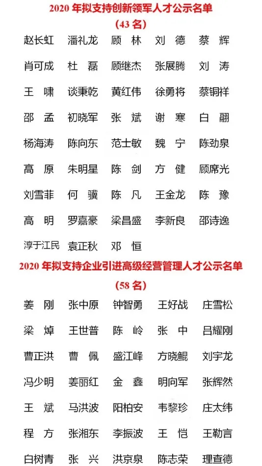 2020年無錫市“太湖人才計劃”由市人才工作領導小組辦公室、市科技局、市工業和信息化局、市財政局、市人力資源社會保障局、市衛生健康委等部門組織實施,經項目初審、現場考察、路演評審、市人才辦聯席會議審議等程序,遴選出擬支持創業領軍人才團隊5 個、創新領軍人才團隊3 個、頂尖醫學專家團隊8個、高端醫學專家團隊1個、創業領軍人才110名、創新領軍人才43名、企業引進高級經營管理人才58名、高端會計人才5名、先進制造技能領軍人才11 名、優秀鄉土人才12名、鄉土人才大師工作室8個。入園企業江蘇金木土科技有限公司范士敏入選創新領軍人才、無錫市和光新能源科技有限公司韋黎珍入選高級經營管理人才。