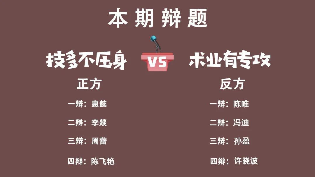 “通百精而精一二”,正方二辯、三辯圍繞"復(fù)合型人才”、“科學(xué)決策”、“時(shí)間管理”、“思維僵化”展開論述,引經(jīng)據(jù)典,形象生動(dòng)。