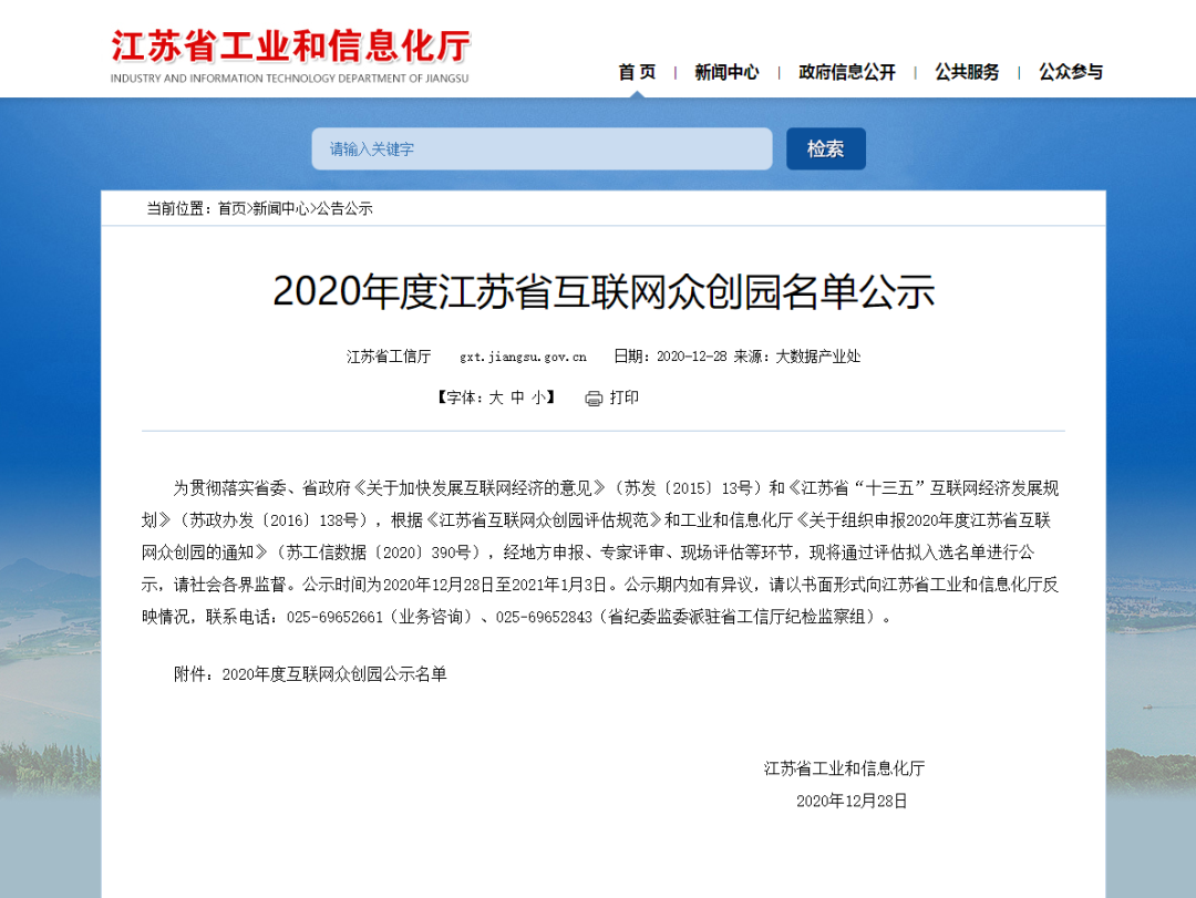 為貫徹落實省委、省政府《關于加快發(fā)展互聯(lián)網(wǎng)經(jīng)濟的意見》(蘇發(fā)〔2015〕13號)和《江蘇省“十三五”互聯(lián)網(wǎng)經(jīng)濟發(fā)展規(guī)劃》(蘇政辦發(fā)〔2016〕138號),根據(jù)《江蘇省互聯(lián)網(wǎng)眾創(chuàng)園評估規(guī)范》和省工業(yè)和信息化廳《關于組織申報2020年度江蘇省互聯(lián)網(wǎng)眾創(chuàng)園的通知》(蘇工信數(shù)據(jù)〔2020〕390號),經(jīng)地方申報、專家評審、現(xiàn)場評估等環(huán)節(jié),江蘇省工業(yè)和信息化廳公示了2020年度江蘇省互聯(lián)網(wǎng)眾創(chuàng)園入選名單,江蘇數(shù)字信息產(chǎn)業(yè)園是無錫唯一一家獲評“2020年度江蘇省互聯(lián)網(wǎng)眾創(chuàng)園”的園區(qū)。
