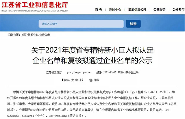 近日,江蘇省工信廳公示了2021年度專精特新小巨人擬認(rèn)定企業(yè)名單,入園企業(yè)無(wú)錫聚新科技有限公司成功獲批江蘇省專精特新產(chǎn)品。