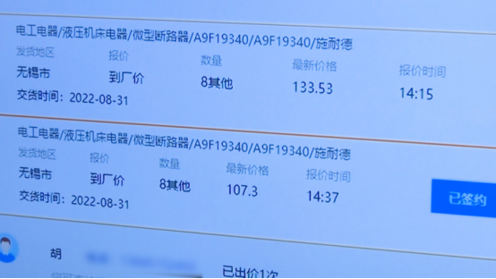 企采牛(無錫)網(wǎng)絡(luò)科技有限公司創(chuàng)始人 潘志明:這個(gè)眾業(yè)達(dá)電器股份有限公司第一次報(bào)價(jià)是133.53元,我們第二家報(bào)價(jià)是116元,第三家供應(yīng)商報(bào)的是107.3元,這是官網(wǎng)價(jià)格是最便宜的,所以他跟著報(bào)了最低的價(jià)格,我們通過比對(duì)之后幫企業(yè)省了價(jià)差,我們幫他節(jié)省了16%,這是我們通過在線化競(jìng)價(jià)之后幫企業(yè)省下的價(jià)格,這是我們提供的價(jià)值。