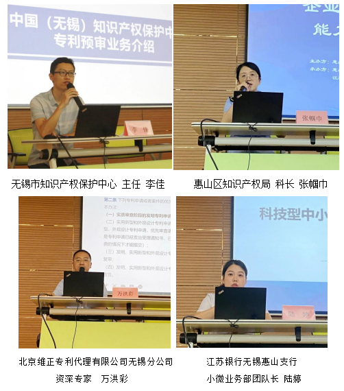 本次培訓邀請了四位行業專家,圍繞企業如何在無錫市保護中心備案及提交專利申請、惠山區知識產權產業政策、企業如何在省級保護中心提交優先審查、知識產權質押融資等內容展開講解及討論。此次培訓節奏緊湊、主題鮮明、注重實效,旨在強化企業知識產權高質量創造、運用、管理和保護能力,促進了知識產權惠企政策落地實施。