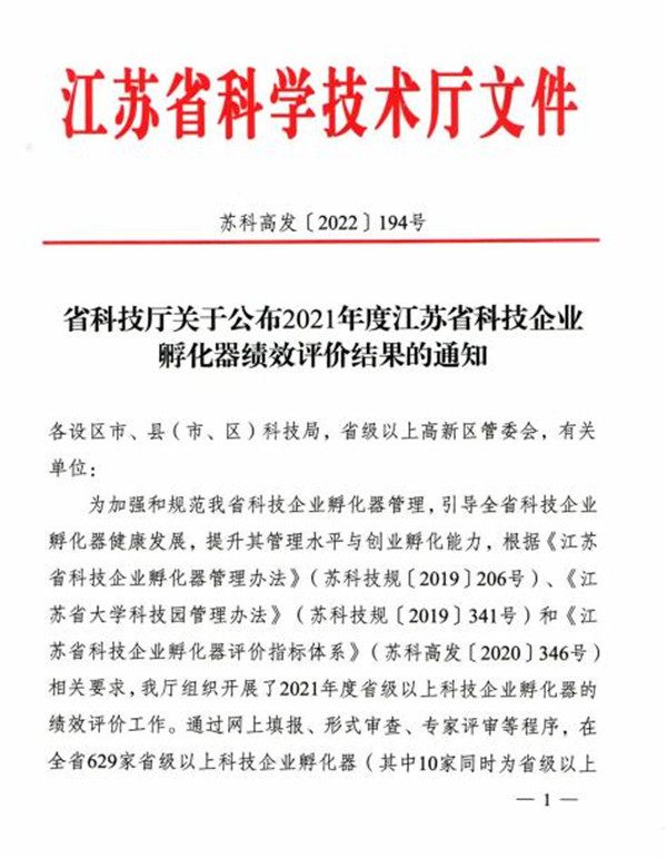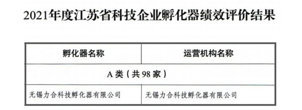 喜訊|無錫力合科技孵化器榮獲2021年度江蘇省科技企業(yè)孵化器績效評價A類