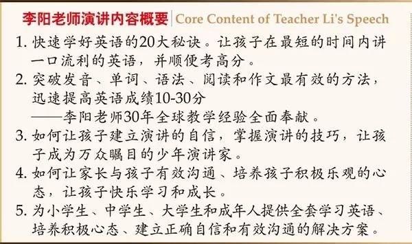 ★這不僅僅是一場快速學好英語秘訣的演講,而是集家庭教育、勵志教育和感恩教育為一體的極有價值的人生課堂,歡迎父母雙方帶著孩子一起參加。