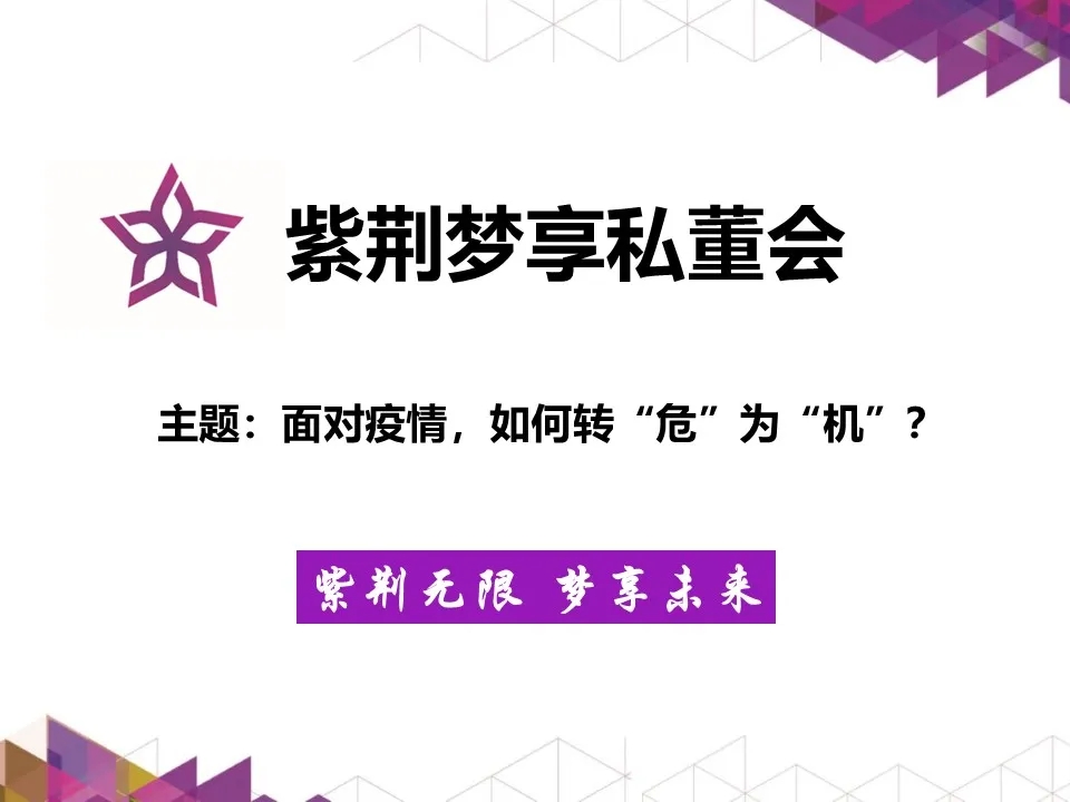 這次疫情“多年不遇”,我們要一起相信國家、相信政府,這場硬仗我們一定能贏!疫情期間,學校“停課不停學”。私董會是“停工不停會”,受疫情影響,我們面對新形勢,采用新方法,紫荊夢享私董會由“線下”轉(zhuǎn)為“線上”,用特別的會議形式記錄這段特殊的回憶。雖然新冠肺炎讓我們的生產(chǎn)經(jīng)營暫時按下了“暫停鍵”,但我們相信隨著抗“疫”的勝利,經(jīng)濟會快速重啟。讓我們一起做好準備,積蓄力量,隨時準備按下“快進鍵”,奪回失去的時間。
